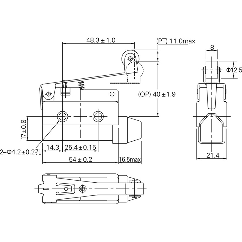 安装孔间距为25.4mm,与RZ型微动开关相同。