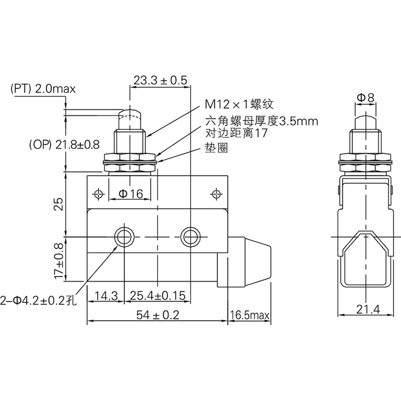安装孔间距为25.4mm,与RZ型微动开关相同。